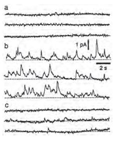 Three traces recorded before A), 10 min B) and 25 min C) after the addition of 1 nM α-Latrotoxin (#LSP-130).