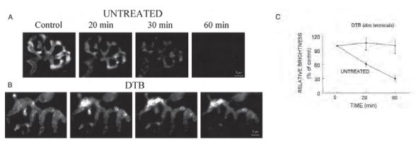 A) and B) Representative images showing the time course of FM1-43 destaining triggered by bath application of 2 µg/ml α-Latrotoxin (#LSP-130) in an untreated terminal and a dim terminal from a DTB-treated mouse. The destaining in untreated terminals appeared to be uniform throughout a terminal and was almost completed in 60 min. In DTB-treated dim terminals, α-Latrotoxin caused redistribution of FM1-43 fluorescence within the nerve terminals, but did not cause dye destaining. C) The average intensity of fluorescence measured before and at 20 and 60 min after α-Latrotoxin application. The data are presented as the intensity normalized to the average fluorescence values prior to α-Latrotoxin treatment (control). The data are the means ± SE of 4 untreated and 5 DTB-treated mice, respectively. *, a value significantly different from untreated control (P ≤ 0.01).