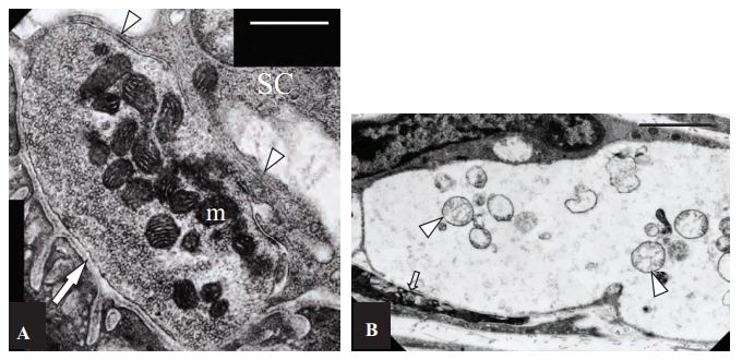 A) Control, non-treated NMJ. The pre-synaptic region of the terminal is filled with closely packed synaptic vesicles. Mitochondria (m) stain darkly, and have well defined and closely apposed cristae. The basal lamina is visible both within the synaptic cleft (arrow), and extending down between individual junction folds. A capping Schwann cell (SC) extends processes (arrowheads) over the surface of the terminal, but these do not extend into the synaptic cleft. Scale bar = 600 nm. B) α-Latratoxin (#LSP-130) treated NMJs appeared extremely swollen and electron-lucent, and the post-synaptic junctional folds (arrow) were flattened. Clusters of mitochondria (arrowheads) in an advanced state of degeneration are evident within the nerve terminal. Scale bar = 1.8 µm.