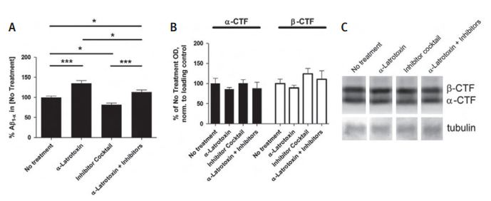 Acute brain slices were made from 4- to 5-week-old wild-type (B6/SJL) or Tg2576 mice. A) To determine the effect of synaptic vesicle exocytosis on extracellular β-Amiloide peptide levels in the absence of synaptic activity, Tg2576 brain slices were cultured for 2 hours in the presence of 0.5 nM α-Latrotoxin (#LSP-130) and/or a cocktail of activity inhibitors including 100 nM TTX, 10 mM NBQX, and 50 mM APV. α-Latrotoxin alone caused a 35%±6.9% increase in β-Amiloide peptide levels, whereas the inhibitor cocktail lowered β-Amiloide peptide levels by 18.0% ±4.1% compared to untreated slices. α-Latrotoxin plus the inhibitor cocktail resulted in 13.3% more extracellular β-Amiloide peptide as compared to untreated slices and 38.3% ± 6.2% more β-Amiloide peptide compared to the inhibitor cocktail alone (n = 12-15 per group). At the end of each experiment, brain slices were washed with PBS and processed by Western blot analysis for the presence of APP-CTF. B) Neither the level of α-CTF nor the level of β-CTF changed over the 2 hours culture period. C) Representative lanes from Western blot. Data represent mean ± SEM.