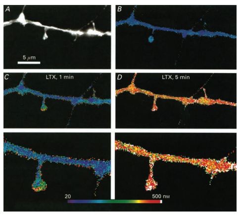 Pseudocolour images of calculated calcium concentrations in a dendritic segment. A) An image of the dendrite and spines illuminated at 360 nm. A small spine is seen on the right, in close approximation to a passing fibre originating in an adjacent, stained neuron. B) Resting level of [Ca2+] in the dendrite and the spines. C) 1 min after onset of exposure to α-Latrotoxin (#LSP-130), a rise of [Ca2+] is clearly higher in the two spines seen than in the dendrite. D) When calcium rises throughout the dendrite, 5 min following application of α-Latrotoxin, there is a smaller difference between spines and the dendrite. Bottom, corresponding high power images of those seen in C) and D). Note the gradient of calcium rise in the spine.
