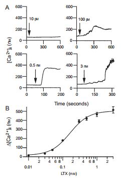 α-Latrotoxin binds to two types of receptors on presynaptic nerve endings: Neurexin and Latrophillin (CIRL). These interactions facilitate the formation of α-Latrotoxin tetramers which function as cation-selective pores in membranes. Both receptors are essential for the toxin pore formation mechanism (membrane integration) but not for the toxin induced exocytosis. The binding of α-Latrotoxin to neurexin is Ca2+-dependent while its binding to CIRL is Ca2+ independent. Cation-selective pores formed by α-Latrotoxin can induce release by allowing Ca2+ to enter into the terminal, forming a Ca2+-dependent release pathway (which is essential for triggering the release of monoamines or peptides from synapses). However, in synapses transmitting GABA, glutamate or Ach, release also occurs in Ca2+ free conditions. This is probably achieved in addition by direct interaction of α-Latrotoxin with synaptic proteins, which bypasses the Ca2+ binding event and leads to activation of exocytosis1,2.
