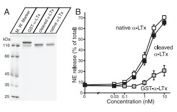 A) Analysis of purified recombinant α-Latrotoxin. Recombinant α-Latrotoxin along with native α-Latrotoxin (#LSP-130) were analyzed by SDS-PAGE and Coomassie staining. B) GST-cleaved recombinant α-Latrotoxin stimulates Ca2+– dependent exocytosis with a similar potency to native α-Latrotoxin. A stimulation of NE secretion from PC12 cells by indicated concentrations of native α-Latrotoxin (white squares; n=12), cleaved recombinant α-Latrotoxin (black squares; n=10), and GST-α-Latrotoxin (gray squares; n=3) is shown. Error bars indicate SEM.