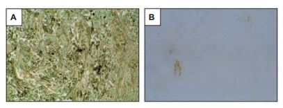 Immunohistochemical staining of primary glioblastoma multiforme (GBM) tumors (A) and normal adult brain temporal cortex (B) specimens using Anti-Aquaporin 1 Antibody (#AQP-001). AQP1 immunostaining in GBM revealed a combination of cytoplasmic and cell membrane staining, whereas normal brain was negative.