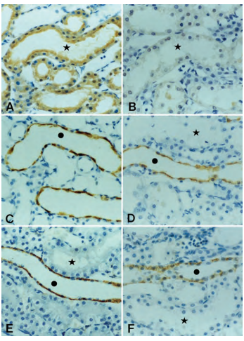Immunohistochemical staining of AQP1, AQP2, and AQP3 in the outer medulla from control and cisplatin-treated rats using Anti-Aquaporin 1 Antibody (#AQP-001), Anti-Aquaporin 2 Antibody (#AQP-002) and Anti-Aquaporin 3 Antibody (#AQP-003). A) Immunoreactivity for AQP1 was most prominent in the apical membrane of proximal tubules. B) The AQP1 labeling decreased markedly with cisplatin treatment. C) The abundance of AQP2 labeling was shown exclusively in the collecting duct principal cells, both in the apical region and throughout the cytoplasm. D) The AQP2 labeling decreased by cisplatin. E) AQP3 was localized to the basolateral membrane of the collecting duct principal cells. F) The AQP3 labeling decreased in the outer medullary collecting duct in response to cisplatin. *, S3 segment of the proximal tubule; •, collecting duct. Magnification, X350.