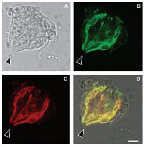 Immunohistochemical staining of rat taste buds double labeled with Anti-Aquaporin 1 Antibody (#AQP-001) and Anti-Aquaporin 2 Antibody (#AQP-002). DIC image of a vallate taste bud (A) and the same taste bud labeled with Anti-Aquaporin 1 Antibody (green, B) and Anti-Aquaporin 2 Antibody (red, C). D) Merged images, highlighting the lack of apical labeling in these taste buds (arrowhead). Scale bars, 10 μm.