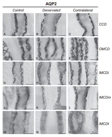 Immunohistochemical staining of AQP2 in control, denervated and contralateral kidneys using Anti-Aquaporin 2 Antibody (#AQP-002) demonstrated marked decrease in AQP2 expression in the inner medullary collecting ducts, and a slight decrease in the expression of AQP2 in the cortical and outer medullary collecting ducts. In addition, AQP2 immunoreactivity was diffusely dispersed throughout the cytoplasm with decreased apical labeling in the denervated kidney, being contrasted by prominent apical labeling in the control. CCD, cortical collecting duct; OMCD, outer medullary collecting duct; IMCDi, IMCDm, IMCDt, initial, middle, terminal parts of inner medullary collecting ducts respectively. Scale bars, 20 μm.