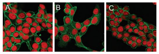 MLE-12 cells were incubated with NOC-18, and stained with Anti-Aquaporin 5 Antibody (#AQP-005), (green). In control cells, most of AQP5 signals are associated with the plasma membrane (A). After 2 hours of treatment with NOC-18, AQP5 staining on the membrane is markedly decreased, and intracellular staining is increased (B). This translocation of AQP5 staining was abolished by the use of methyl-β- cyclodextrin (C).