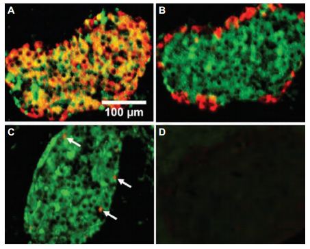 Immunohistochemical staining of rat pancreatic β-cells, double labeled with Anti-Aquaporin 7 Antibody (#AQP-007), insulin and glucagon. A) AQP7 labeling (green) overlaps with that of insulin (red), but not with that of glucagon (red, B). C) AQP7 labeling (green) overlaps with that of somatostatin (in red, indicated by arrows). D) Negative control performed in the absence of primary antibodies. Scale bar, 100 μm.