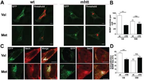 Figure 1. Mutant Huntington’s (mhtt) Reduces the Number of Val-BDNF but not MetBDNF Vesicles.