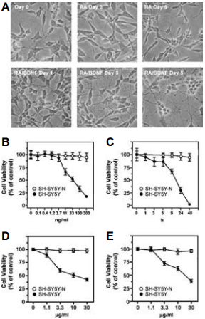 A) SH-SY5Y cells were differentiated by sequential treatment with retinoic acid (RA) and Recombinant human BDNF protein (#B-250). The undifferentiated SH-SY5Y (filled circle) and the differentiated SH-SY5Y-N cells (empty circle) were treated for 16 h with various doses of camptothecin (B), etoposide (D), and cisplatin (E) or 30 ng/ ml camptothecin over a time course (C). Cell viability was analyzed by the trypan blue exclusion assay.