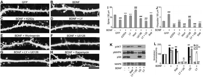 The micrographs depict close-up views of 15 days in vitro (DIV) dendritic protrusions from hippocampal neurons transfected with GFP on 6 DIV and treated with Recombinant human BDNF protein (#B-250) alone or with drugs for 24 h starting on 14 DIV. GFP control (A), Recombinant human BDNF protein (20 ng/ml) (B), and coapplication of Recombinant human BDNF protein with K252a (200 nM) (C), LY294002 (D; LY), wortmannin (E; Wort), U0126 (F; U0), LY294002 plus U0126 (G), and rapamycin (H; Rap). I) and J) show mean for spine and filopodia densities, respectively. K), L) Western blot analysis to ascertain the efficacy and specificity of treatment with Recombinant human BDNF protein and pharmacological inhibitors for the above morphological experiments. Sister coverslips were harvested and probed for pAkt, pMAPK, and pS6. A representative experiment is shown (K). L) Quantifications of the western blots from three independent experiments.