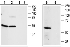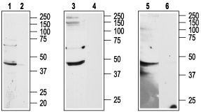 1, 3, 5. Anti-Adenosine A2B Receptor (extracellular) Antibody (#AAR-003), (1:200).2, 4, 6. Anti-Adenosine A2B Receptor (extracellular) Antibody, preincubated with the negative control antigen.