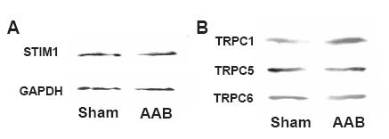 A) Marginal changes in STIM1 were detected in hypertrophied heart compared with normal heart using Anti-STIM1 (extracellular) antibody (#ACC-063) in western blot analysis. B) TRPC1 expression using Anti-TRPC1 antibody (#ACC-010) was significantly increased in rats subjected to AAB (whereas TRPC5 and TRPC6 expression was unchanged using Anti-TRPC5 (#ACC-020) and Anti-TRPC6 (#ACC-017) antibodies. Each experiment was repeated three times with the same results.