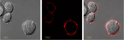 Right: Merge of both images. As can be seen, Agitoxin-2-Cys-TAMRA is localized with the membrane-anchored KV1.3 K+ channel.We would like to thank Mr. Vladimir Kiss and Dr. Noga Alagem from the Weizmann Institute of Science for their help with the confocal microscope images.