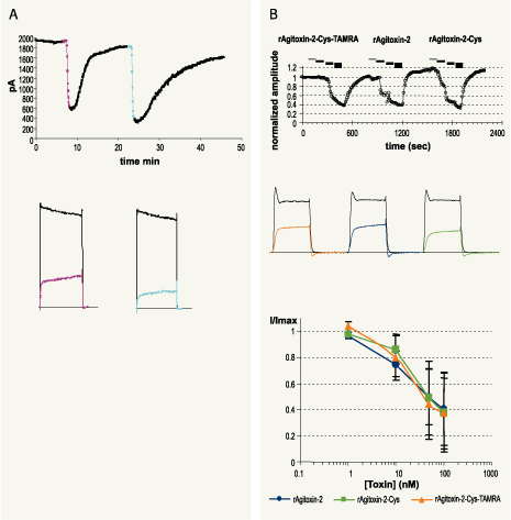 Bottom: Superimposed traces taken from the same experiment shown on top, before (black) or during toxin perfusion (pink or blue).B. Dose response of KV1.3 current inhibition in Xenopus oocytes for Agitoxin-2, Agitoxin-2-Cys-TAMRA and Agitoxin-2-Cys (product has been discontinued).Top: Time course of current amplitude, upon toxin perfusion. Currents were elicited from resting potential of -100 mV, by a 100 ms test pulse to 0 mV, delivered every 10 seconds. The bars above the plot represent periods of toxin perfusion, for each toxin sequential applications of the following concentrations: 1, 10, 50 and 100 nM, where the toxin species is indicated.