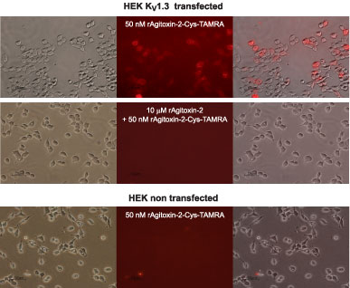 Top: Staining of HEK-293 cells stably expressing KV1.3 channels with 50nM of Agitoxin-2-Cys-TAMRA (#RTA-420-T). Cells were incubated for 30 minutes with the fluorescent toxin, washed with PBS and visualized. In the middle section the image acquired with a Rodamine filter is shown and on the right it is merged with the bright light image of the same field to illustrate cellular staining.