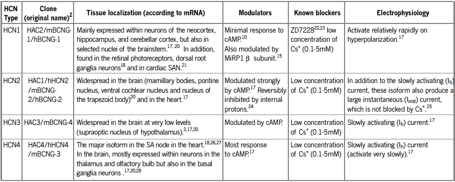 All known members of the HCN channel family (HCN1-4) are expressed in the brain, whereas only HCN1, HCN2 and HCN4 are expressed in the heart (see Table 1)6,16,17. Based on in situ hybridization, the expression of HCN4 is significantly higher than these of HCN2 and HCN1 in the SAN18.