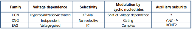 The ability of excitable cells to generate rhythmic, spontaneously firing action potentials is called pacemaking. In heart, pacemaking is accomplished by rhythmic discharge of the sinoatrial node (SA node). The firing rate is determined by a specific current slowly depolarizing a membrane to the threshold level, triggering the action potential. The ionic conductance underlying the cardiac pacemaking was identified over 20 years ago and termed If (f for funny)1, 2. At the same time, a similar current was described in neurons and in retina, termed, respectively, Ih (h for hyperpolarization-activated) and Iq (q for queer)2. The unique features of If/Ih/Iq current are: (1) its activation by hyperpolarization; (2) conductance of Na+ and K+ ions (K+/Na+ ~3-4); (3) blocking by low concentration (0.1-5 mM) of extracellular Cs+; (4) enhancement by cyclic AMP (cAMP). Surprisingly, the cAMP dependence was not mediated by protein phosphorylation, but involved direct binding of the cyclic nucleotide to the channel2.