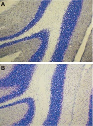 Immunohistochemical staining of rat cerebellum using Anti-ET-A antibody (#AER-001) (A), or Anti-ET-A antibody preincubated with the negative control antigen (B). Cresyl violet is used as the counterstained. The specific staining is black.