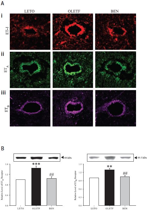 A) Confocal images showing showing immunofluorescence labeling for ET-1 (i), ET-A (ii) and ET-B (iii) in left ventricular tissue sections from control rats (LETO), diabetic rats (OLETF) and benidipine treated diabetic rats (BEN) using Anti-ET-A and Anti-ET-B antibodies respectively (#AER-001 and #AER-002). Both vascular and extravascular regions are more immunoreactive in diabetic rats than in those in control rats and Benidipinetreated rats. Original magnification is x400. B) Western blot analysis of ET-A (left) and ET-B (right) from left ventricular tissues of control, diabetic and benidipine-treated rats. ± SE; n = 12 animals. **P < 0.01 and ***P < 0.001, compared with corresponding values obtained in LETO rats; #P < 0.01, compared with corresponding values in OLETF rats without any treatment.