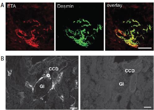 The endothelin receptor system is distinctly involved in the regulation of renal function under both physiological and pathophysiological conditions. The effects of ET-1 in kidney have been attributed to both subtypes of GPCRs by the use of specific agonists and antagonists of these receptors. The receptors also have functions leading to vasoconstriction as well as vasodilation, important in the regulation of renal vascular resistance15,16. However, direct evidence for the cellular distribution of both receptors was limited until recently. Using Anti-ET-A, immunohistochemistry studies showed that ET-A colocalizes with desmin in mesangial cells17 (Figure 4A). In the renal cortex, ET-A also is found to colocalize with aquaporin 2 (using Anti-Aquaporin 2 antibody (#AQP-002)) in collecting ducts but not in the outer medulla. In order to indisputably show that the signals were specific to the receptor, the immnunoreactivity of the ET-A receptor was completely abolished by preabsorbing Anti-ET-A with the antigen used for immunization17 (Figure 4B).