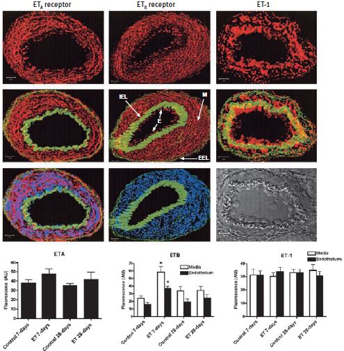 Endothelin, a 21–amino acid peptide, has potent and sustained vasoconstrictive effects on vascular smooth muscle both in vivo and in vitro and is found in three different isoforms; ET-1, ET-2 and ET-3. Although expressed by other cell types, ET-1 is mainly expressed by the vascular system in endothelial cells. ET-1 binds and activates two G-protein coupled receptors (GPCRs), ET-A and ET-B (extensively reviewed in Reference 1). While the former has been attributed to vasoconstriction, the role of ET-B depends mostly on its location; on one hand it could promote vasoconstriction and on the other stimulate nitric oxide (NO) release-a known vasodilator2. ET-1 is implicated in pulmonary arterial hypertension as well as systemic hypertension models including deoxycorticosterone acetate-salt (DOCA) hypertension3-5. Contributing factors to the development of pulmonary hypertension are the elevated levels of circulating endothelin (ET-1). The direct implication of increased ET-1 on the pulmonary circulation was studied4. The study leads to the conclusion that following four weeks of chronic administration of ET-1, pulmonary hypertension was not developed. What was observed however, among other effects, following a 7-day administration of ET-1, was a three-fold increase of ET-B (but not ET-A) in both the intima and media of small pulmonary arteries detected under confocal microscopy imaging using Anti-ET-A and Anti-ET-B antibodies ((#AER-001 and #AER-002), respectively) which returned to normal after 28 days (Figure 1). Surprisingly, there was no increase in ET-1 expression in pulmonary arteries which was explained by the assumption that increased plasma ET-1 had no in vivo effect on vascular smooth muscle ET-1 production4 (Figure 1).