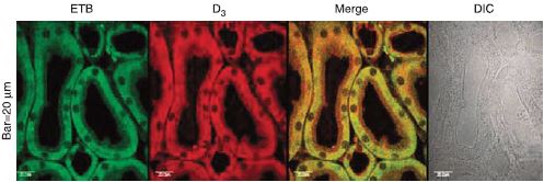 D3 dopamine receptor and ET-B colocalize using Anti-ET-B antibody (#AER-002) in kidneys from rat. Colocalization appears as yellow after merging the images of fluorescein isothiocyanate-tagged ET-B receptor (green) and Alexa 568-tagged D3 receptor (red). No staining is seen without the antibodies (DIC). DIC, differential interference contrast.