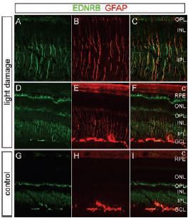 Figure 6. Immunostaining of Accumulation of ET-B and GFAP in Muller Cells in Light-Damaged Retinas.