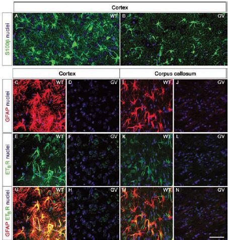 Figure 7. ET-B Immunoreactivity in Astrocytes Around the Ischemic Lesion in WT but not GFAP-/-Vim-/- (GV) Mice.