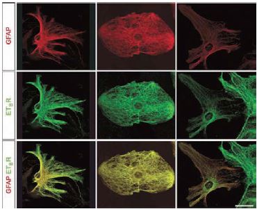 An additional indication that the endothelin signaling system is present and functional in the neuronal system is from a recent study where ischemia was inflicted in mice and ET-B presence was monitored among various other parameters. ET-B colocalized with GFAP and vimentin around the ischemic lesion in immunohistological studies while no receptor was detected in GFAP-/- Vim-/- mice suggesting that the intermediate filaments, GFAP and vimentin, are required for the production, stability, or distribution of ET-B in reactive astrocytes23(Figure 7). In addition, using cultured astrocytes the same study showed that by laser-scanning confocal microscopy, there was a remarkable colocalization between bundles of intermediate filaments and ET-B immunoreactivity in wild type cells23 (Figure 8).