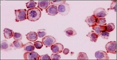 HERG protein detection in leukemic cell line FLG 29.1 Cells were immunostained with an Anti-KCNH2 (HERG) Antibody (#APC-062) directed against the C-terminus of HERG (magnification was 20X).