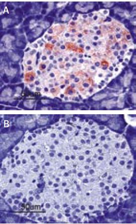 Staining of rat pancreas with Anti-Kir6.2 Antibody (#APC-020). (A) Strong granular staining in a number of cells within the Islets of Langerhans is readily detected (red). (B) The negative control slide shows no staining.