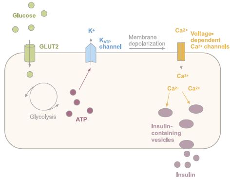 Glucose enters the pancreatic β-cell through the GLUT2 transporter. The glucose is converted to ATP by the glycolysis pathway. Elevated cytoplasmic ATP levels close the KATP channels generating a membrane depolarization, which in turn opens voltage-dependent Ca2+ channels. Insulin is then secreted from cytoplasmic Ca2+-dependent secretory vesicles.