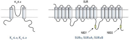 The KATP channels are heteromultimers of two radically different subunits. The pore-forming subunit is composed of members of the inward rectifier Kir6.x subfamily that includes two members: Kir6.1 and Kir6.2. The Kir6.x subunits exhibit the common topology of the inward-rectifier superfamily: two transmembrane domains flanking a highly conserved pore region with the N and C-terminus located intracellularly. The other component of the KATP channels is the sulfonylurea receptor (SUR) that is a member of the ATP-binding cassette (ABC) superfamily. There are three different isoforms of the SUR subunit SUR1, SUR2A and SUR2B, where the last two are alternative splice variants of the same gene. Similarly to other members of the ABC superfamily, the SUR subunits display 17 transmembrane domains with two cytoplasmic nucleotide-binding domains (NBDs) (see Figure 1)1,2. The functional KATP channel is an octamer composed of four Kir6.x and four SUR subunits which can assembly to form different subunit combinations. Thus the pancreatic β-cells KATP channel is formed by Kir6.2/SUR1 subunits, Kir6.2/SUR2A or Kir6.1/SUR2A form the cardiac KATP channel while Kir6.1/SUR2B subunits compose the vascular smooth muscle (VSM) KATP channel. The different types of KATP channels differ not only in their tissue expression but also in their pharmacology and sensitivity to ATP.