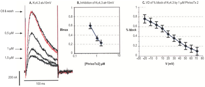 Phosphorylation also plays a major role in KV4 channel function and modulation as the KV4.2 sequence contains consensus sites for ERK/MAPK, PKA, PKC and CaMKII14. These channels were shown to be phosphorylated by PKA15. Both KV4.2 and KV4.3 are specifically and reversibly blocked by the peptidyl toxins, Phrixotoxin-216 and Heteropodatoxin-217. Phrixotoxin-2 is isolated from Phrixotrichus auratus tarantula spider venom while rHeteropodatoxin-2 is an E.coli expressed recombinant toxin, originally isolated from the venom of the Heteropoda venatoria spider. Phrixotoxin-2 blocked KV4.2 and KV4.3 channels in COS-transfected cells with an IC50 of 34 and 71 nM respectively16. In Xenopus oocytes the toxin was less potent and inhibited KV4.3 with an IC50 of 650nM. Heteropodatoxin-2 blocked transient outward K+ current (Ito) in ventricular myocytes in a voltage dependent manner with an IC50 (at –10 mV) of 16 nM17.