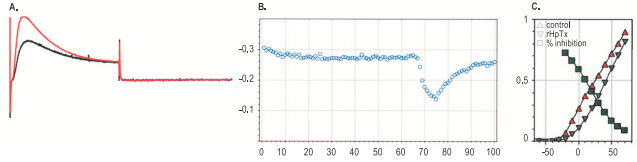 A. Current responses to 100 ms depolarization to 0 mV from holding potential of -100 mV, delivered every 10 seconds before (red) and during application of 500 nM Heteropodatoxin-2 (#STH-340). B. Time course of amplitude inhibition. The horizontal bars indicate the periods of Heteropodatoxin-2 perfusion. C. I-V relationships for KV4.2 before and during Heteropodatoxin-2 perfusion. Also included the fraction of inhibited current as function of the voltage step (green squares).