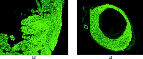 P2X1 receptor immunnoreactivity in the smooth muscle layer of urinary bladder (A) and vas deferens (B) using Anti-P2X1 Receptor Antibody (#APR-001). Photographs generously provided by C. Vial and R.J. Evans, University of Leicester, UK.