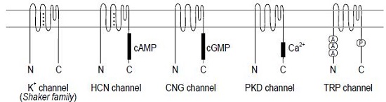 TRP channels belong to the superfamily of cation channels with six transmembrane segments (see Figure 1). This superfamily includes voltage-gated K+, Na+, and Ca2+ channels, as well as cyclic nucleotide gated (CNG) channels, hyperpolarization activated cyclic nucleotide gated (HCN) channels, and the most closely related group, polycystins (PKD)4,5. TRP channels contain specific ankyrin domains in the cytosolic N-terminal portion and proline-rich motif in the cytosolic C-terminal portion.