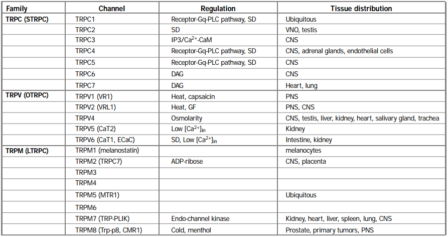 TRP channels are a large family (20 genes) of plasma membrane, non-selective cationic channels that are either specifically or ubiquitously expressed in excitable and non excitable cells. These proteins are divided into three main subfamilies on the basis of sequence homology; TRPC, TRPV and TRPM1 (see Table). Like the KV channel family, the TRP family can also form heteromers consisting of different members of the same subfamily. Their non-selective cationic nature makes them depolarizing agents, while their calcium permeability makes them as transducers leading to [Ca2+]in elevation. However, there are many different gating mechanism and/or modulating agents that activate and inactivate different members of this channel family (for reviews see2,3).