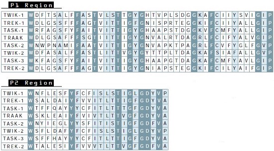 Figure 2. Alignment of conserved regions of mammalian tandem pore domain K+ channels.