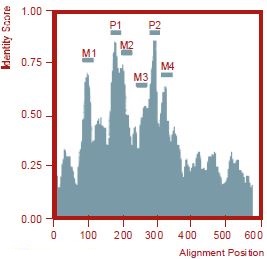 Among the transmembrane domains (M1-4), M2 is most highly conserved. A long extracellular segment precedes the first pore domain. The intracellular N-terminal and C-terminal domains are not conserved. A smooth-by-11 filter was applied after multiple sequence alignment to calculate the identity score.