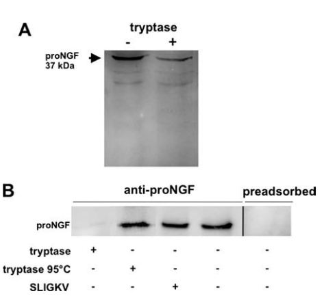 A. Western blot analysis of human testicular peritubular cell (HTPC) supernatants with and without tryptase treatment using Anti-proNGF Antibody (#ANT-005). B. Western blot analysis using Anti-proNGF Antibody. proNGF was treated with tryptase. A significant decrease in the proneurotrophin level was observed. No decrease was observed in heat inactivated tryptase or by the addition of SLIGKV.