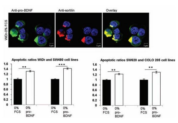 A. Immunocytochemical staining of SW480 cells. Cells stained with Anti-proBDNF Antibody (#ANT-006) show that the proneurotrophin colocalizes with Sortilin. B. Recombinant human proBDNF (cleavage resistant) protein (#B-256) treatment increases apoptotic ratios in WiDr and SW480 cells (left panel) and SW620 and COLO 205 colorectal cancer cells.