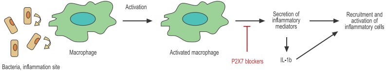 The P2X7 receptor is widely expressed throughout the hematopoietic lineage. The receptor has been found in T and B cells, dendritic cells (DCs), macrophages, and mast cells and has been implicated in several physiological activities. Although inflammation is often alluded to in the context of pathological conditions such as asthma and atherosclerosis, it is in fact an essential component of a complex mechanism designed to deal with tissue injury and infection. Inflammation often starts when tissue injury (caused for example by invading bacteria) initiates the secretion of chemical signals that recruit different cell populations such as neutrophils, mast cells, dendritic cells, and macrophages. These cells constitute the first line of defense and will on one hand attack the invading bacteria by phagocytosis (macrophages and neutrophils) and on the other hand enlist the cells that are responsible for the permanent eradication of the pathogen (T cells). The P2X7 receptor that is expressed on all the cells involved in the inflammatory process has been identified as a key player in the regulation of inflammation (see Figure 2).