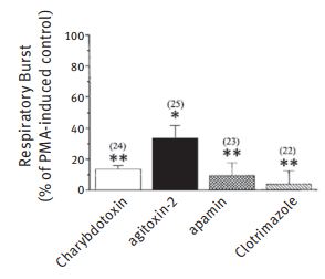 Damage by reactive oxygen species caused by the activation of microglia has been documented in Alzheimer’s disease. Several K+ channels have been shown to be involved in this respiratory burst by blocking current in cultured rat glia using the specific K+ channel blocker Agitoxin-2 (#STA-420).11 Blockage of the respiratory burst by Agitoxin-2 further demonstrated the involvement of K+ channels. Western blot analysis of microglial lysates using Anti-KV1.3 (KCNA3) Antibody (#APC-002) Anti-KV1.5 (KCNA5) Antibody (#APC-004) and Anti-KCNN3 (KCa2.3, SK3) (C-term) Antibody (#APC-103) and confocal imaging corroborated these findings. KV1.3 blockers Charybdotoxin (#STC-325), Agitoxin-2 and α-Dendrotoxin reduce neuron killing by microglia as shown by TUNEL analysis of neurons treated by activated microglia. KCa3.1 is highly expressed in microglia, as shown by immunobloting with Anti-KCNN4 (KCa3.1, SK4) Antibody (#APC-064) and has been shown to be a possible therapeutic target in acute and chronic neurodegenerative disorders.13
