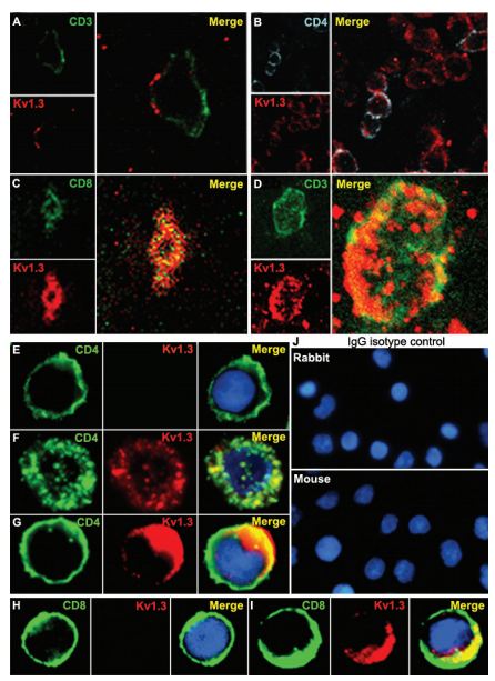 Immunohistochemical staining of KV1.3 in human MS brain floating sections using Anti-KV1.3 (KCNA3) Antibody (#APC-002). Confocal microscopy of KV1.3 and CD3/CD4 in MS brain tissue. Confocal microscopic images of 20-µm floating sections of postmortem MS brain tissue. (A and B) Parenchymal infiltrate with positive CD3 and punctate KV1.3 staining in the membrane. (C)A cluster of lymphocytes stained positively for KV1.3 and CD4, as well as occasional CD8 (Inset). (D) CD3- cells showed extensive KV1.3 and CD3 colocalization in the membrane. Immunofluorescent staining of PB-derived T cells concentrated on a slide by cytospin showed membrane patterns of staining of CD4, CD8, and KV1.3. (E) Day 7-activated naive and TCM are CD4-, CCR7- (data not shown) and KV1.3-. (F) Chronically stimulated resting TEM were CD4-, CCR7- (data not shown) and expressed KV1.3 in the membrane but with minimal colocalization with CD4. (G) TEM that had been recently activated expressed increased amounts of KV1.3 and demonstrated more colocalization with CD4 similar to the brain tissue lymphocyte in D. (H) Naive CD8- T cells expressed no KV1.3 but, when chronically stimulated and activated (I), exhibited intense KV1.3 expression and colocalization with CD8. (J) Isotype controls using nonspecific rabbit primary antibody followed by usual secondary label and with primary rabbit anti-human and nonspecific labeled mouse anti-rabbit secondary antibody showed no background staining.