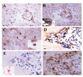 Immunohistochemical staining of KV1.3 in inflammatory cells in human MS braining using Anti-KV1.3 (KCNA3) Antibody(#APC-002). Paraffin sections were stained by indirect immunoperoxidase for KV1.3, CD3, CD4, CCR7, and CCR5. Areas used in sectioning were from a white matter plaque. There were many perivascular inflammatory cells that stained positively for CD3 (A), KV1.3 (B), and CD4 (B Inset) on consecutive sections. (C) KV1.3 was also localized on inflammatory cells in the white matter parenchyma (Inset reveals membrane polarization of KV1.3 staining). (D) Consecutive sections through another perivascular infiltrate revealed numerous KV1.3- inflammatory cells, which were predominantly CCR7- (E) (Inset reveals rare CCR7 positive staining), and CCR5- (F). (Scale bar, 50 µm in A and B and 20 µm in C, D, E, and F.)