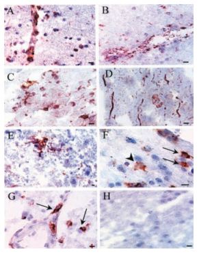 Immunohistochemical staining of KV1.3 in normal appearing white and grey matter in human MS brain using Anti-KV1.3 (KCNA3) Antibody(#APC-002). MS brain cryostat sections that were grossly uninvolved were examined for KV1.3 expression. (A) KV1.3 deposits were found on perivascular and parenchymal inflammatory cells in the normal appearing white matter. (B) Many of these cells stained positively for CD68. (C) KV1.3 staining was also seen on parenchymal cells in the gray matter. (D) Phosphorylated neurofilament staining showed axonal fragmentation and swelling in a normal appearing gray matter area, which was a consecutive section for the KV1.3 staining seen only on inflammatory cells in C. (E) Some of the cells were branched process bearing cells with an appearance suggestive of microglia. (F) Double labeling identified some KV1.3- cells as CD68- cells (arrows red-KV1.3, dark brown CD68); not all CD68 cells expressed KV1.3 (arrowheads). (G) Double labeling with CD3 (dark brown) and KV1.3 (red) was also clearly seen. Not all KV1.3- expressing cells are CD68 positive. (H) Control of the immunoperoxidase reaction. (Scale bar, 20 μm in A, B, D, G, and H; 50 μm in C and F; and 10 μm in E.)