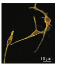 Representative confocal immunofluorescence images of rat microglia showing colocalization of the membrane-delimited marker, OX-42, with KV1.3. OX-42 primary antibody was used with a biotinylated secondary antibody and FITC-conjugated streptavidin (green labeling), and Anti-KV1.3 (KCNA3) Antibody(#APC-002) primary antibodies were used with a Cy3-conjugated secondary antibody (red labeling). For each cell, the same confocal plane was used for acquisition, thus colocalization of channel and microglial membrane is represented by yellow regions in the merged images.